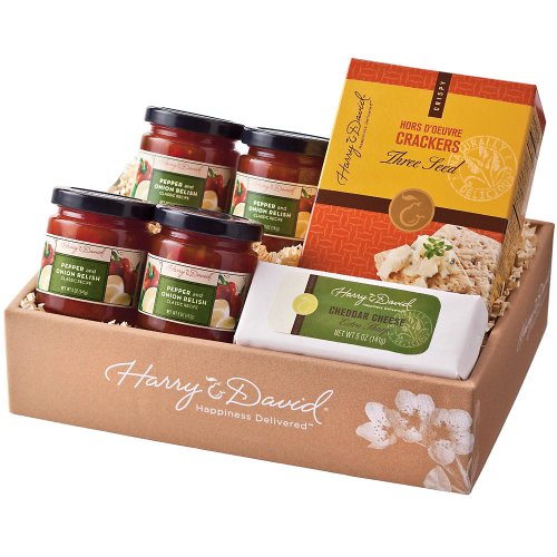 Good old cheese and crackers have long been the easy go-to snack. And naturally, we love them. But we've added a little twist. This banquet is a fun and simple gift that features our famous pepper and onion relish. Spread a little of this onto a three-seed cracker and top it with a slice of white sharp cheddar. You've got the ultimate savory snack. This has become a favorite afternoontime snack in our office. And we're pretty sure you'll enjoy it, too.